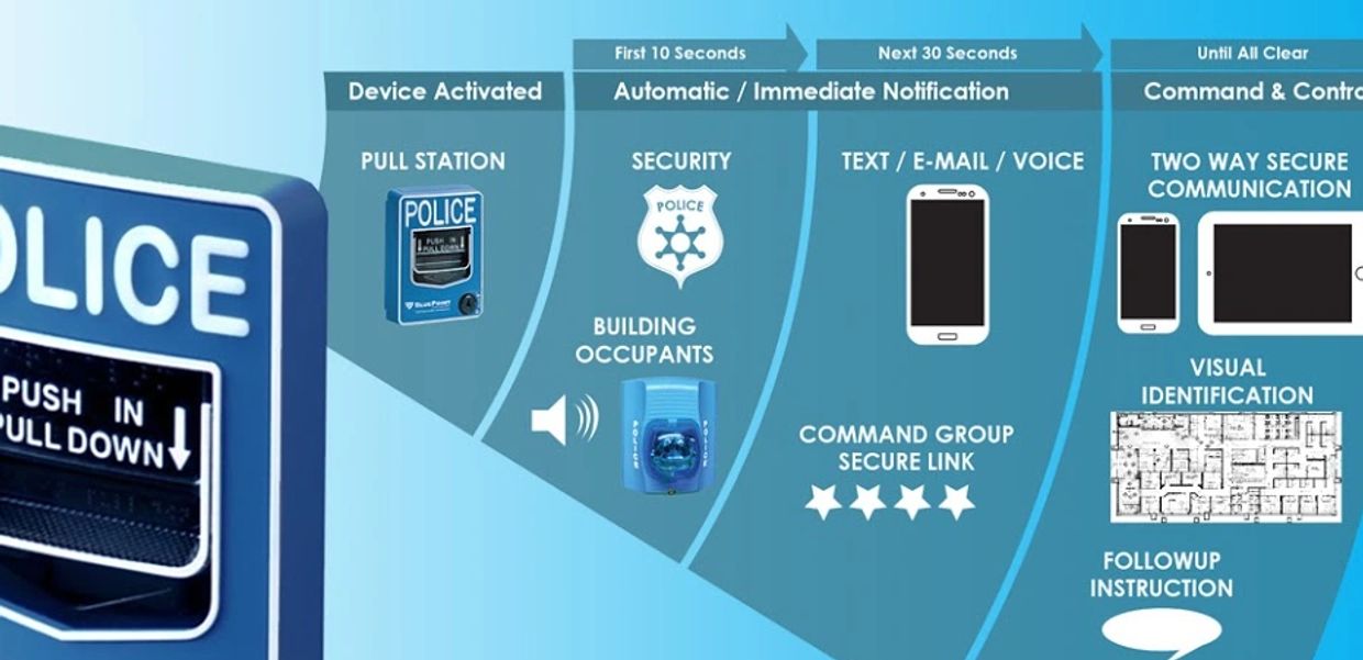 The BluePoint solution has been built for use in crisis situations. With adrenaline flowing and panic setting in, the user interface has to be familiar, simple, and intuitive so that people will actually use it. No one has to be trained on how to activate our solution—only when to use it and what to do after activation. Our solution is enhanced with wearable mobile pendants in addition to standard pull stations. This provides even greater ability for people moving about the building to immediately and securely activate the system if they see a problem.